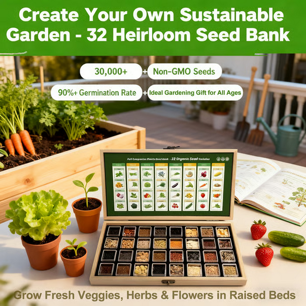 Ready to transform your garden and grow your own food? Order your Raised Garden Bed Heirloom Seed Bank now and start planting! With 32 varieties of Non-GMO heirloom seeds and over 30,000 seeds total, this is your step toward a sustainable and fruitful gardening experience.